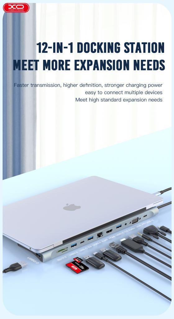 Docking Station της εταιρίας XO που συνδέεται σε Laptop με θύρα USB-C. Εξοπλίζεται με συνδέσεις για τις περιφερειακές συσκευές όπως: